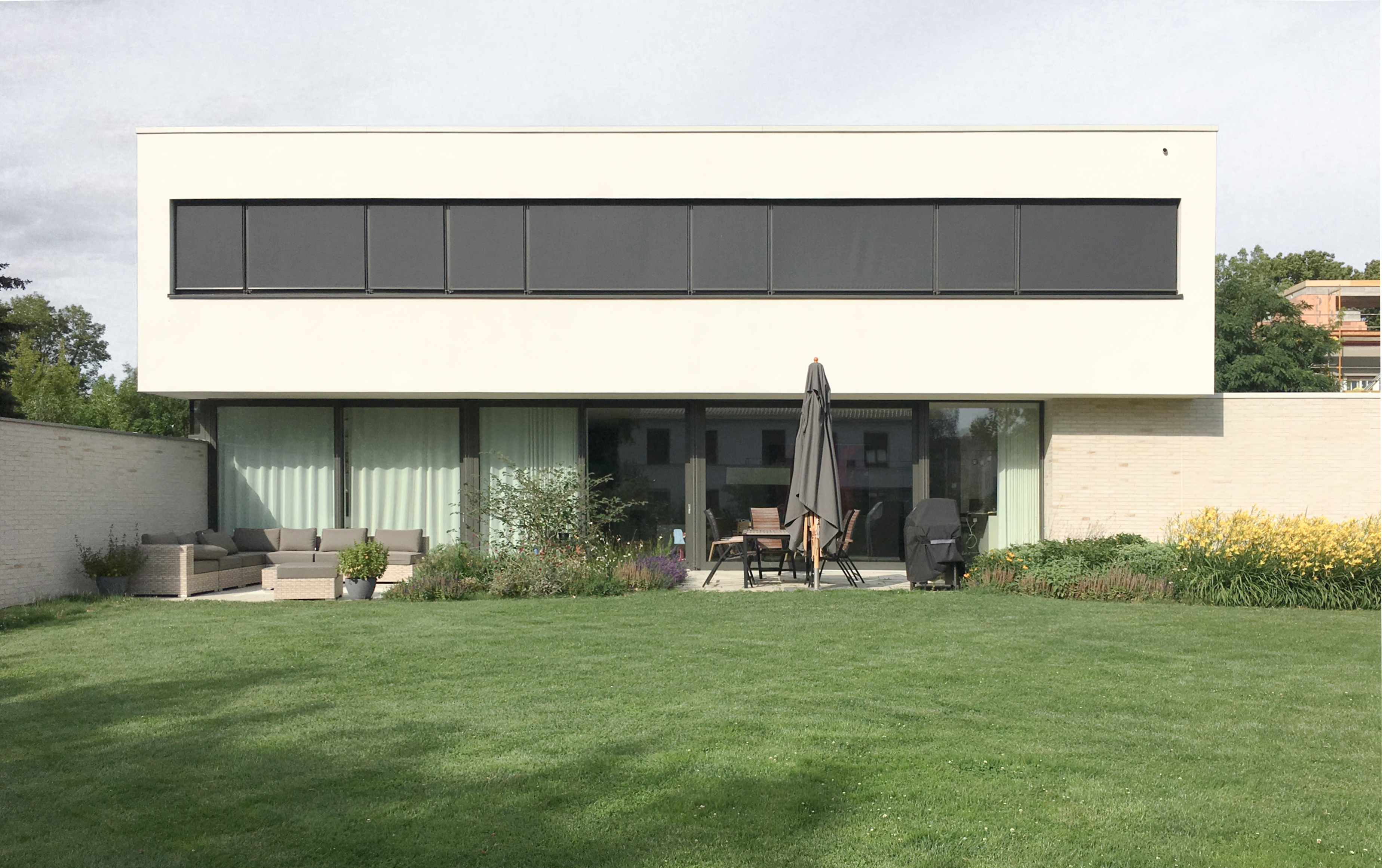 Das auf der Eingangsseite verschlossene Wohnhaus öffnet sich konsequent nach SW in den abgeschirmten privaten Garten. Die Wohnräume sind vollständig verglast, geschützt durch das Auskragen des Baukörpers im OG. Die Öffnungen der einzelnen Zimmer im OG werden zu horizontalen Fensterbändern zusammengefasst.